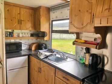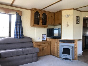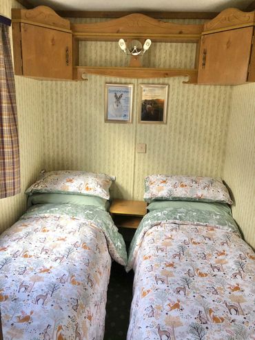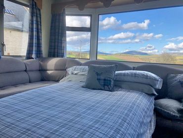 Our static caravan, which we have located in a quiet, private location by the steadings on our farm, enjoys stunning views of the valley below. It has 2 bedrooms and a sofa bed so is suitable for 4-6 people. It has a fully equipped kitchen, spacious living area, central heating, TV, bedding and towels included.